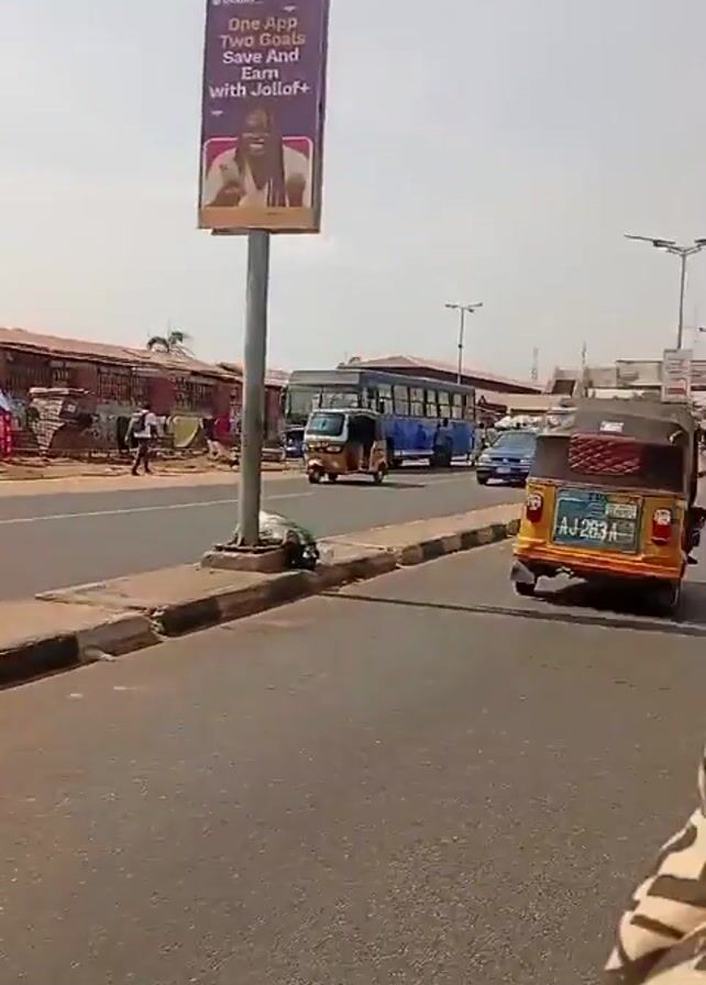 street scene in what appears to be a city in Africa. The shot is taken from a moving vehicle. On the left side of the road, there's a row of market stalls with various goods on display. People are seen walking around the market area. Across the street, there's a large blue bus parked, and people are crossing the road, heading towards the market. There are also motorcycles and auto-rickshaws moving along the road. A sign advertising "Jollof+" is visible on a pole. The sky is bright, indicating a sunny day.