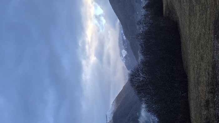 A landscape scene featuring a partly cloudy sky above a mountainous region. The mountainside is covered in vegetation, with a distinct line of trees separating the mountain from a field. Patches of snow are visible on the mountain. The sky transitions from a dark blue to a brighter, cloudier hue.