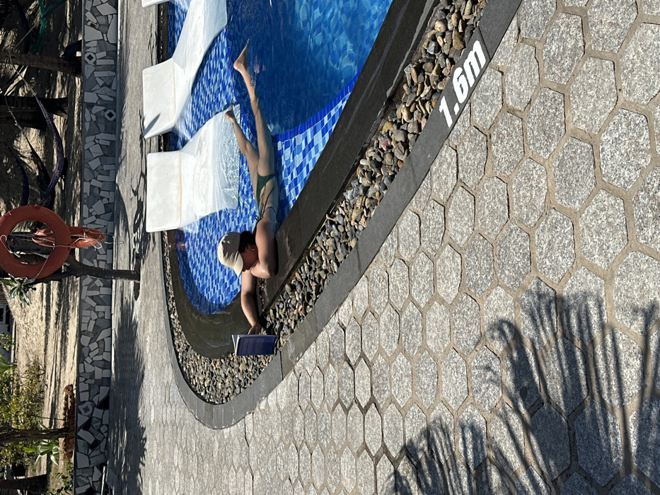 A person wearing a bathing suit and hat relaxes poolside, legs in the water. They are reading a blue book. The pool edge is marked "1.6m." The pool is lined with blue and white tiles. The poolside area is paved with gray hexagonal stones. Tree shadows fall across the paving. A life preserver hangs nearby.