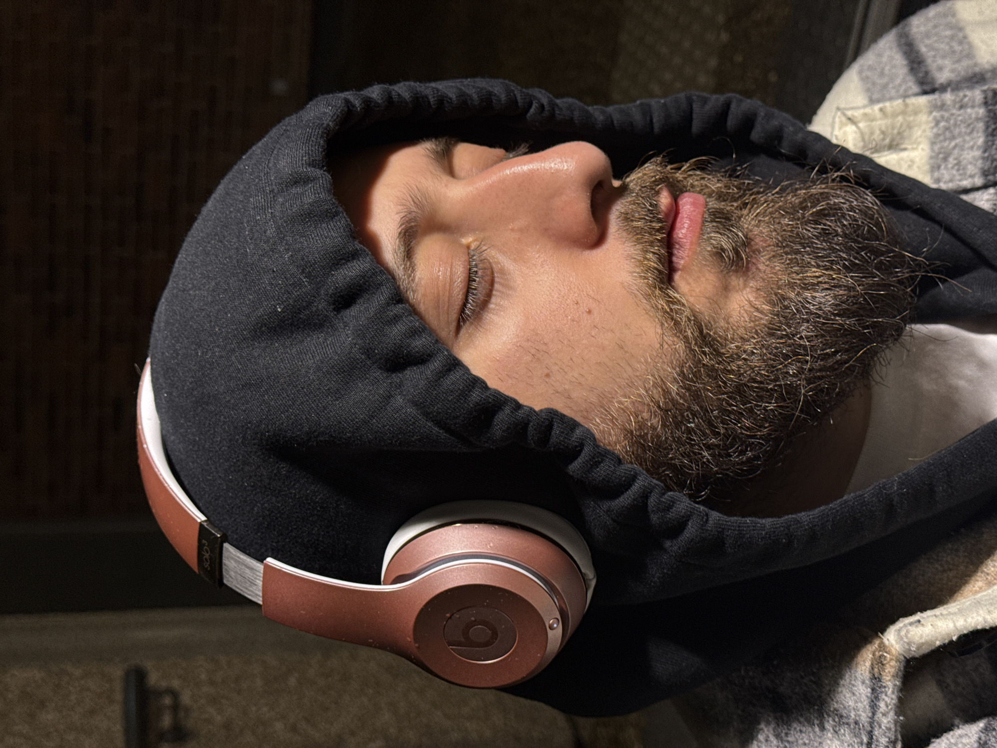 A close-up, angled shot features a man resting, wearing a black hooded sweatshirt and Beats headphones