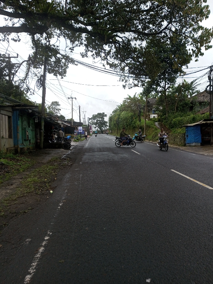 The image depicts a two-lane asphalt road on an overcast day in Serpang Shalli, Bhutan. The road surface appears damp, exhibiting a broken white line on the left shoulder and a solid yellow line on the right lane. Overarching the scene is a dense canopy of green trees, with a large branch displaying epiphytic ferns extending across the upper frame. On the left side of the road, a dirt and grass shoulder borders a series of single-story structures. One prominent building in the mid-ground features a weathered blue-green facade and an open front, revealing an interior consistent with a shop or repair facility. Several motorcycles are parked or stationary near this building. Multiple utility poles carry a dense network of overhead wires along this side, and a solitary individual is observed walking further down the road. On the right side of the road, a vegetated embankment slopes upwards. A small, makeshift structure covered by a blue tarp is visible in the foreground, with a house partially obscured by trees further in the distance amidst lush greenery. Three individuals are operating motorcycles on the road: one in the foreground-right rides a blue/silver motorcycle towards the viewer, while in the mid-ground, a person with a passenger on a dark motorcycle and another individual on a lighter motorcycle travel away from the viewer. Additional motorcycles are visible in the distance, also proceeding away. The sky is uniformly overcast.