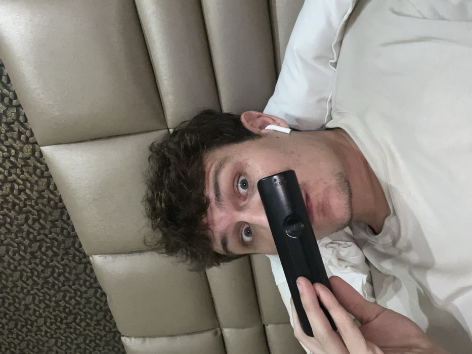 A male individual, appearing to be in his late twenties to early thirties, is depicted in a medium-shot selfie, positioned in a bed within what appears to be a hotel room in Mumbai, India. He has short, dark, curly hair and light facial stubble. His eyes are wide open, fixed on the camera. He is wearing a plain light-colored crew-neck t-shirt and a white wireless earbud is present in his right ear. He holds a black remote control horizontally with his left hand, positioning it across his lower face, obscuring his mouth and nose. His head rests on a white pillow against a light-beige, segmented, padded headboard. The wall above the headboard features a dark, textured geometric pattern.