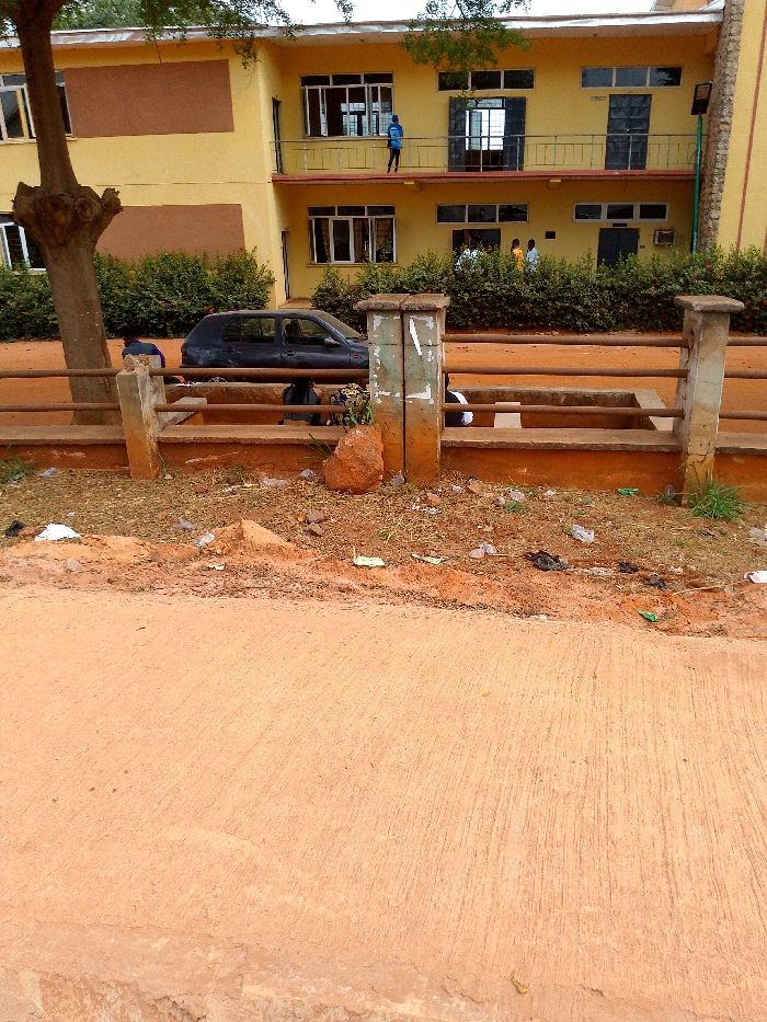The image presents a ground-level view of an outdoor scene in Nsukka, Nigeria, featuring a two-story institutional building
