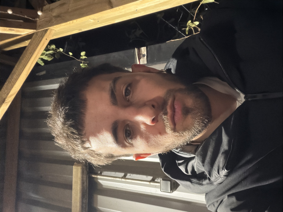 A man with short, dark hair and a trimmed beard looks into the camera. He is wearing a black hoodie and a white shirt. The background shows a wooden structure, possibly a pergola, with string lights and some greenery. A corrugated metal wall is also visible. The image is rotated, giving a tilted perspective.