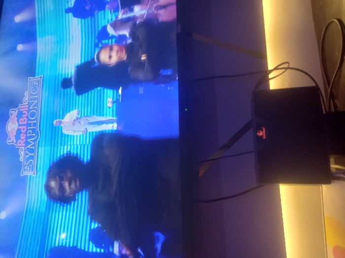 The image displays a television screen broadcasting a "Red Bull Symphonic" event