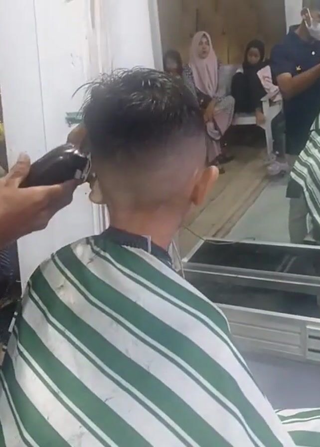 boy getting a haircut in what appears to be a barbershop. The boy is seated and wearing a striped barber's cape. A barber is using electric clippers to cut the hair at the back of his head, creating a fade effect. A mirror in front of the boy reflects the barber working and shows a group of women and children sitting and watching in the background. One woman is wearing a hijab. The environment seems to be a simple, modestly decorated barbershop.
