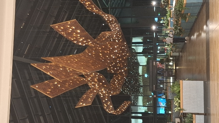 An abstract art piece hangs from the ceiling, constructed of woven material illuminated with numerous small lights. Rectangular panels and swirling ribbons form the sculpture. Reflected in the glass windows behind it are planters and a few people. The floor is light brown wood. The overall setting suggests an indoor public space, such as an airport terminal or shopping mall.