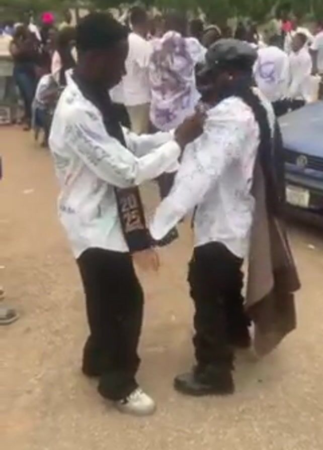 two people standing outside among a large group of people. They are both wearing white shirts with writing on them, black pants, and black shoes. The person on the left also has a black graduation stole that says 2025 in white lettering. The person on the right has a black hat and a brown and black cape. The person on the left is adjusting the cape on the person on the right. In the background, there are many people in similar white shirts. A blue car is parked on the right side of the frame. The ground is a dirt-like surface. The video seems to be taken outside in a natural light setting.
