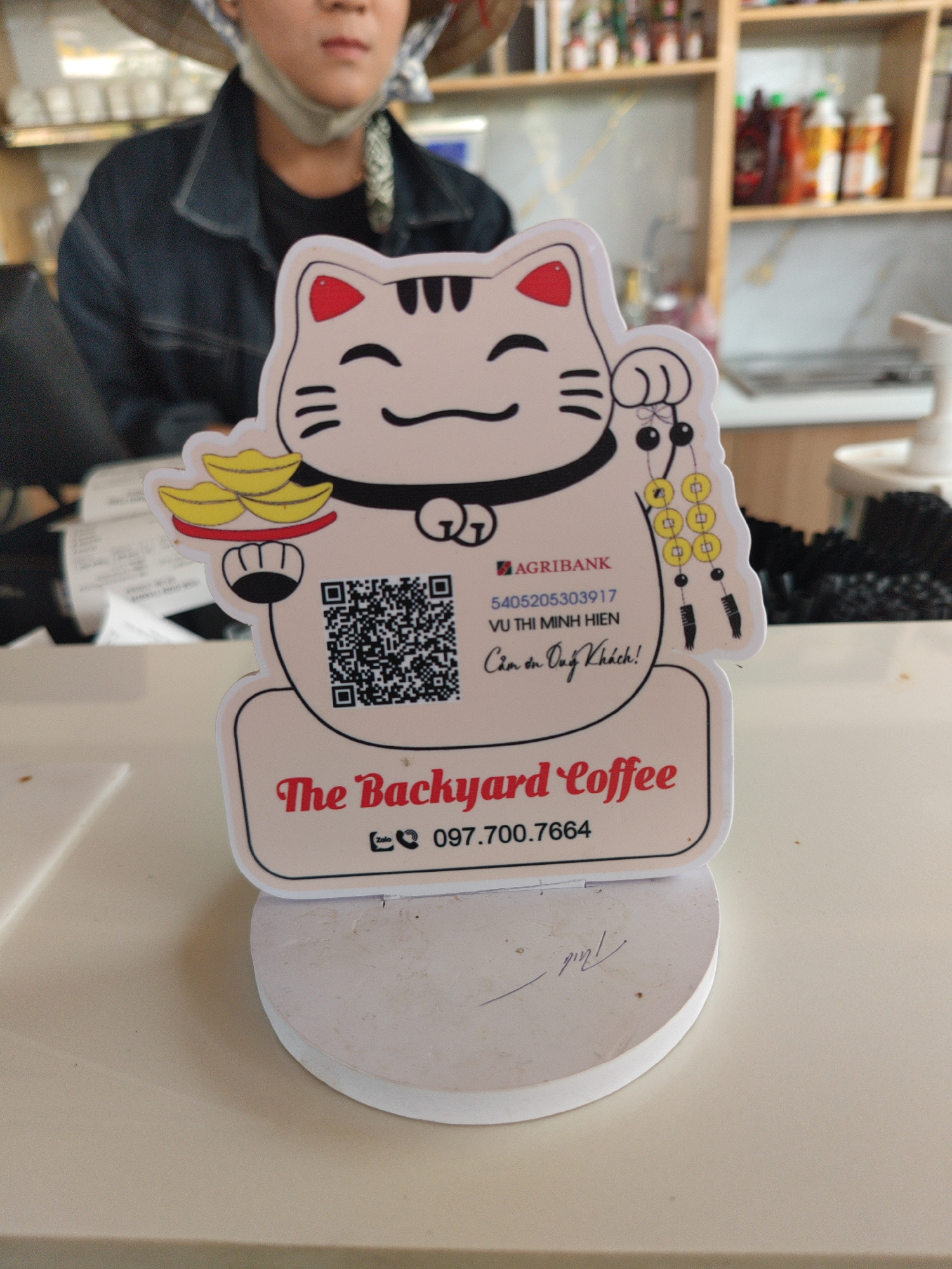 promotional sign for "The Backyard Coffee," featuring a cartoon of a lucky cat holding a plate of gold coins and a string of coins. The sign includes a QR code, banking information for AGRIBANK (account number 5405205303917, holder VU THI MINH HIEN), and the Vietnamese phrase "Cảm ơn Quý Khách!" (Thank you, esteemed customer!). The phone number 097.700.7664 is also displayed. The sign is resting on a white, circular base on a countertop. A person wearing a conical hat and a denim jacket is partially visible in the background, along with shelves of various items. The location can be inferred as D'Ran, Vietnam, based on the Vietnamese language and banking information.