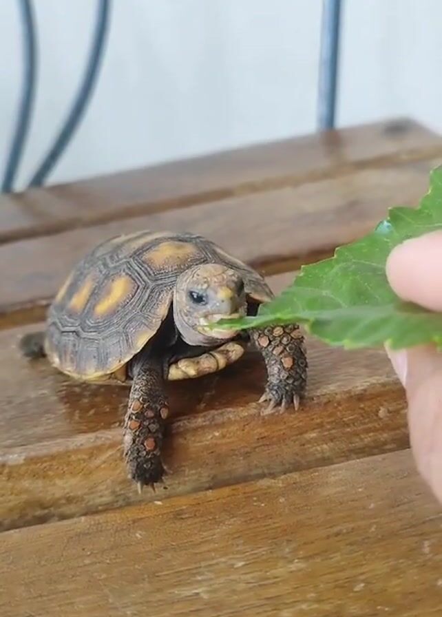 On a slatted wooden surface, a small turtle eats a green leaf offered by a hand. The turtle has a brown and yellow shell with speckled legs. The background shows a blurred white wall and a metal frame.