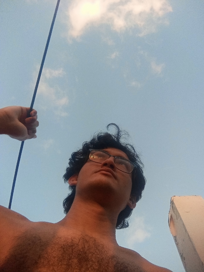 - "A low-angle shot features a shirtless person with curly hair and glasses looking upwards" by FM-mb5fu1, licensed under CC BY 4.0