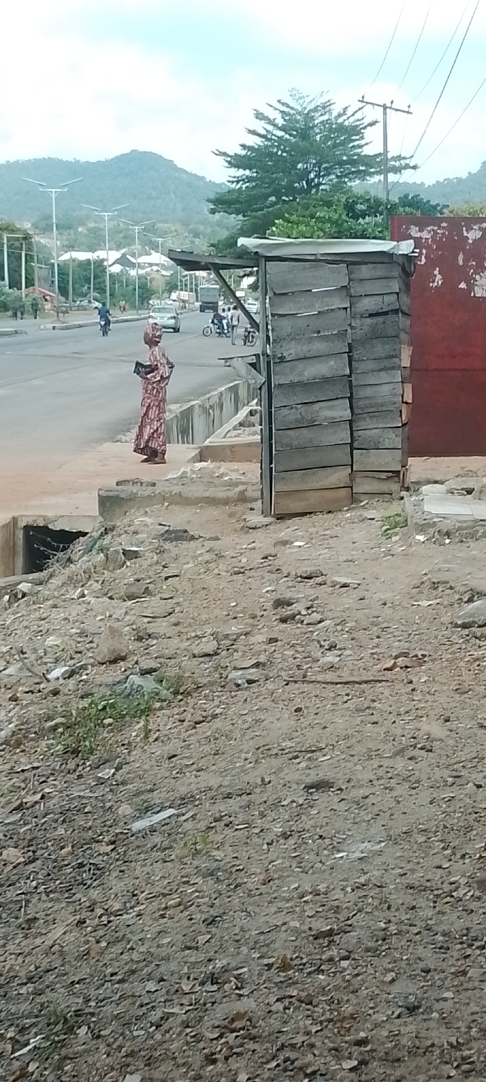 The image depicts a roadside scene in Lokoja, Nigeria, under a hazy sky