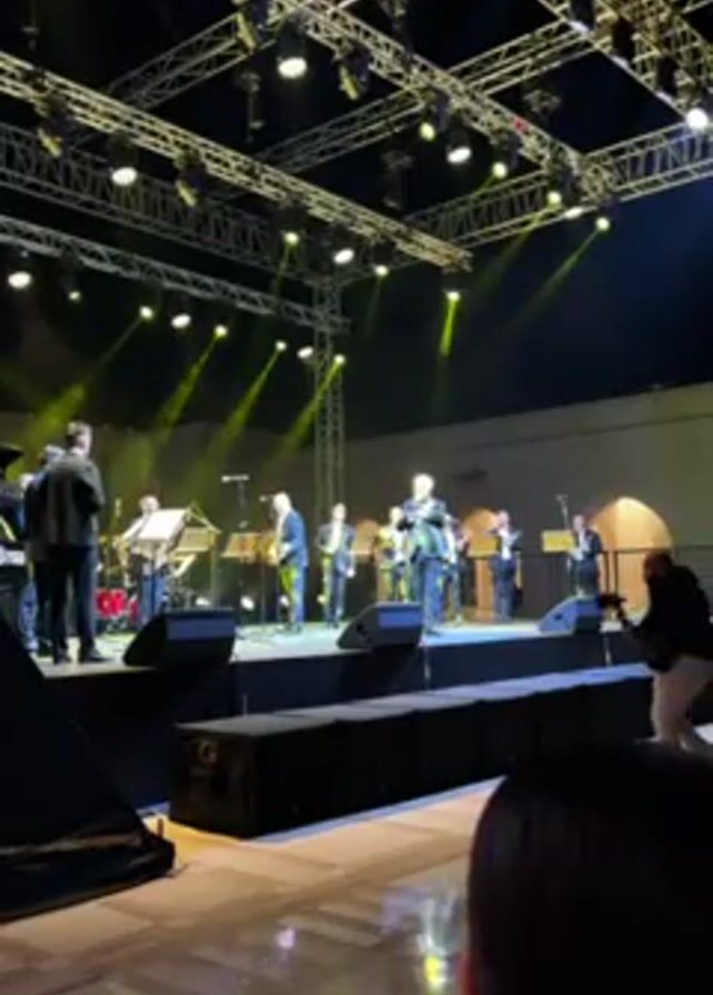 A band is performing on an outdoor stage. The band consists of a singer in a dark suit and several musicians playing brass instruments. The stage is illuminated by bright white and green spotlights. Above the stage is a complex metal structure with various lights. In the foreground, an audience member is visible. Another person in a jacket and light pants walks around on stage, taking photos. The setting appears to be an outdoor event at night, with a building with arched windows in the background.