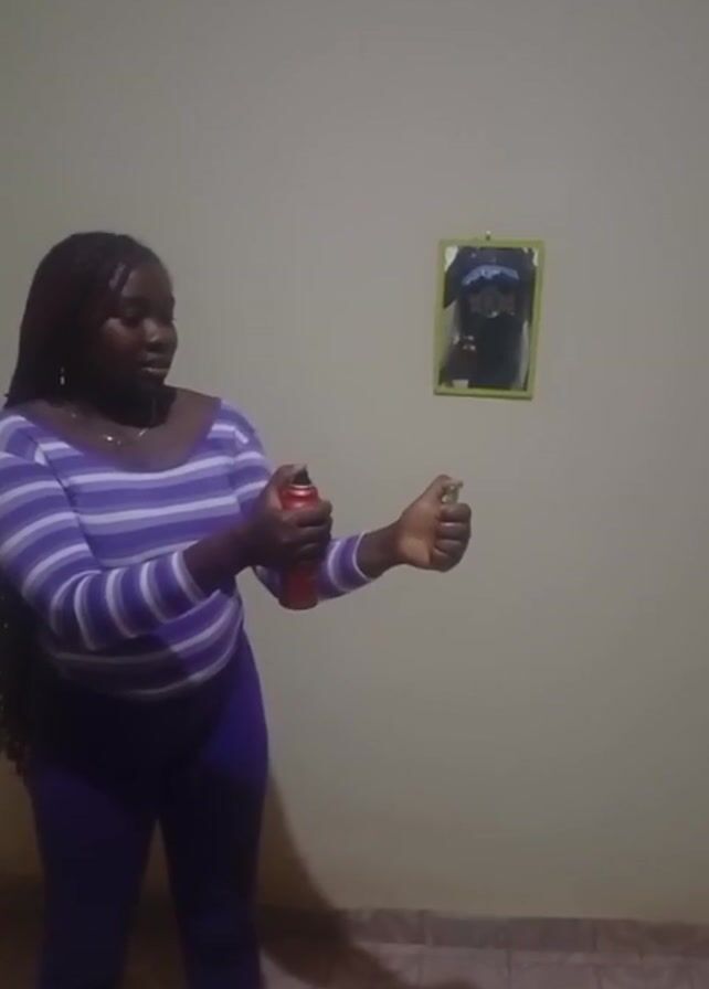 A woman in a purple and white striped shirt and purple leggings is holding two aerosol cans and spraying one of them. The camera angle shifts and the floor can be seen. Several items are on the floor including cans, bottles, and what appears to be a black tote bag. The camera lens points upwards toward a ceiling or wall.