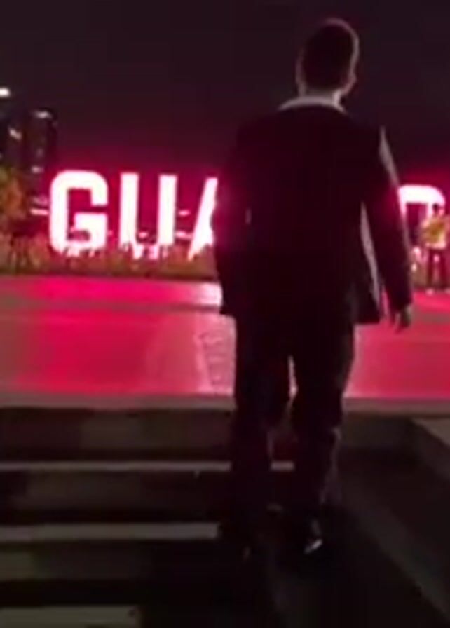At night, a woman and a man are walking up a set of stairs, approaching a large, illuminated "GUAYAQUIL" sign. The man is wearing a dark suit, and the woman is wearing a light-colored top and dark pants. Two other people are visible near the sign. The background includes buildings and lights, suggesting an urban setting. The area appears to be a public space or park.