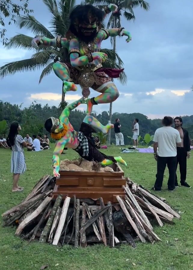 lawn with a sculpture of three colorful figures atop a pile of wood. The top two figures are posed to look as if they are fighting, while the bottom figure is on his knees. Several people are gathered around. Some are standing near the sculpture, and others are sitting or standing on the lawn. A pavilion is visible in the background, where a band is performing. The video then follows a young woman walking across the lawn.
