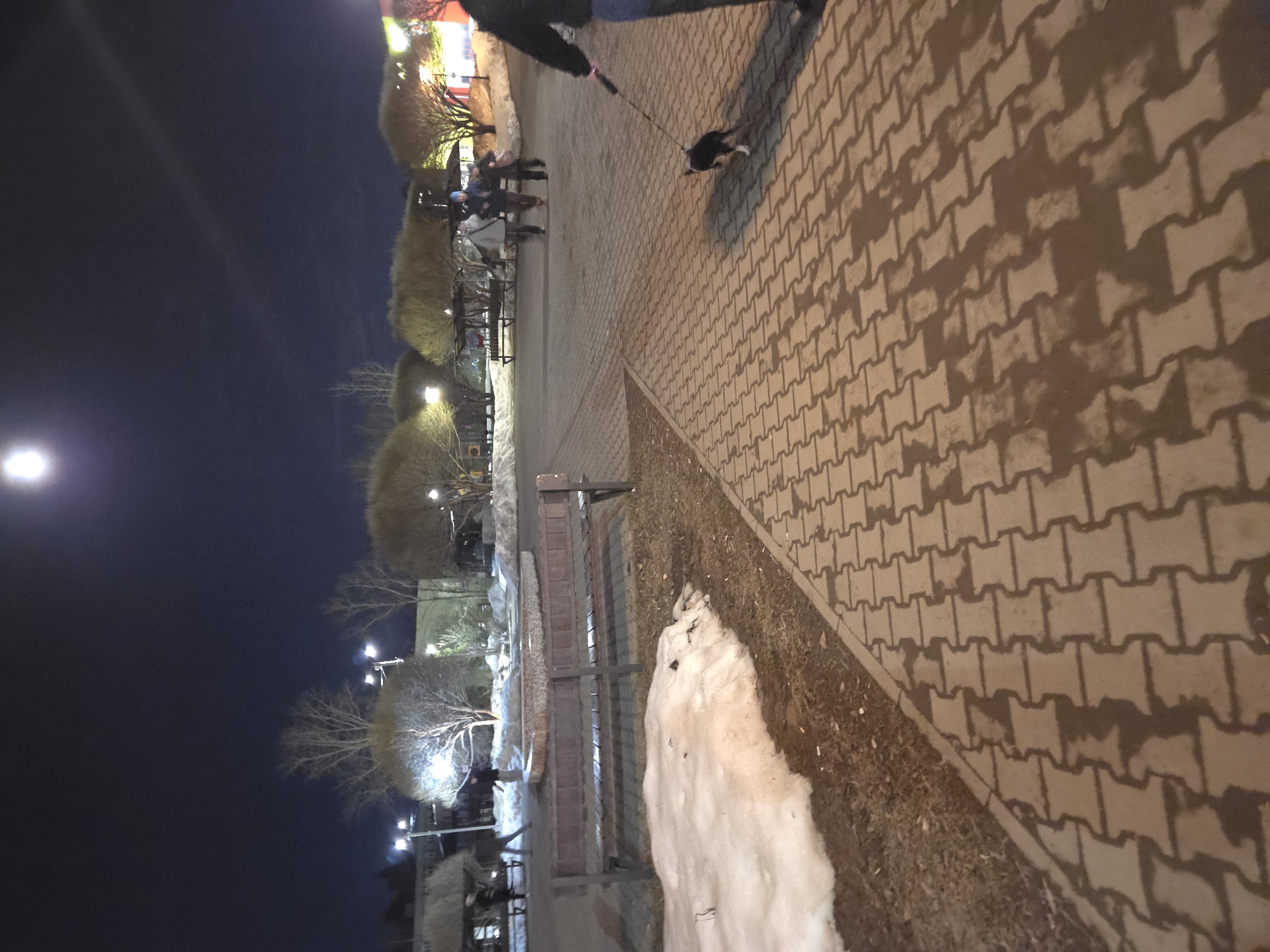 The image is taken at night in Chaikovsky, Russia. The scene shows a walkway made of interlocking pavement bricks. A person is walking a small dog on a leash along the path. To the left of the walkway, there are benches and patches of snow on the ground. In the background, there are trees and streetlights, creating a diffused glow. Several other people are also present further down the path. The sky is dark and the moon is visible.