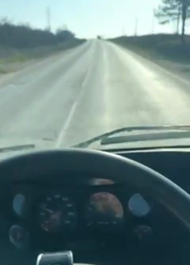 view from inside the cab of an Iveco truck driving on a paved road with vegetation on either side