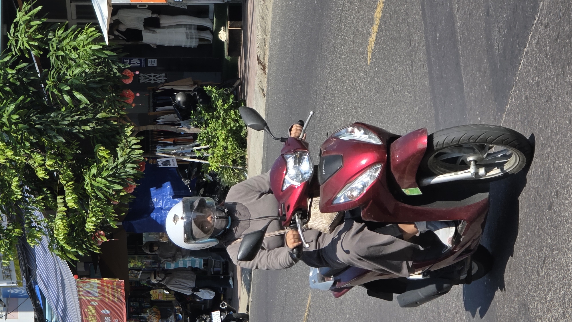 A person wearing a white helmet and gray clothing is riding a red scooter on a gray asphalt road. The scooter is facing the right side of the frame. A street with shops and trees is visible in the background. The location is Unknown, Vietnam.