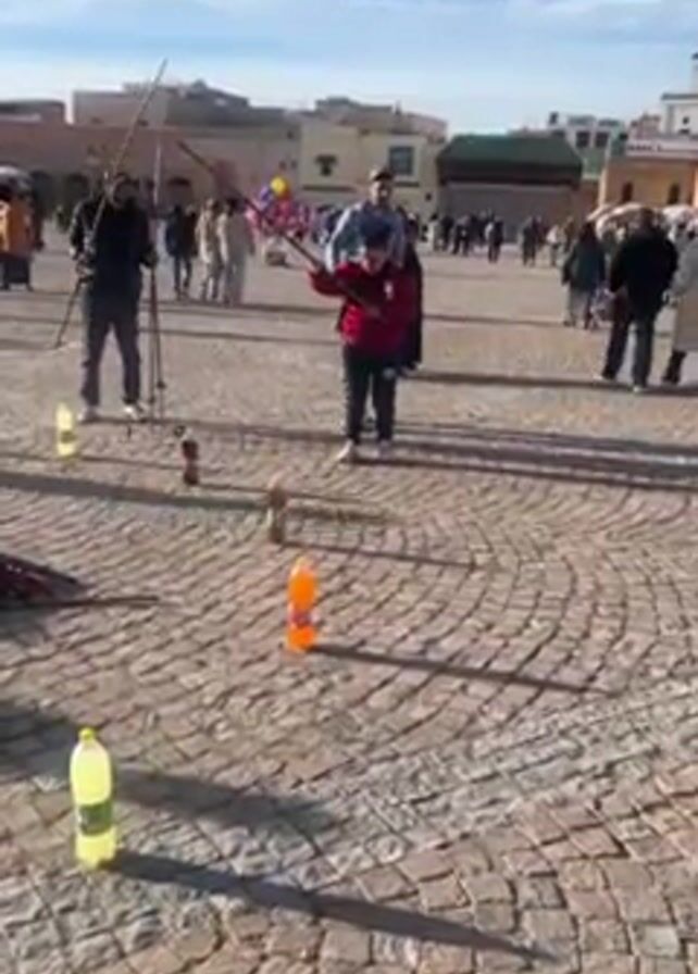 A video shows three men playing a game in a public square. The square is paved with cobblestones arranged in a circle pattern. In the center are several plastic bottles of varying colors set up as targets. The men are using long, thin poles to try to knock down the bottles. The first man is dressed in a black jacket and pants and is holding his pole upright. The second man, a younger boy, is wearing a red jacket and black pants and is in the process of swinging his pole towards the bottles. The third man is wearing a light blue sweater and black pants and appears to be filming the game on his phone. There are other people walking around in the background, and several buildings are visible on the edge of the square. The sky is blue with some clouds, indicating a sunny day.