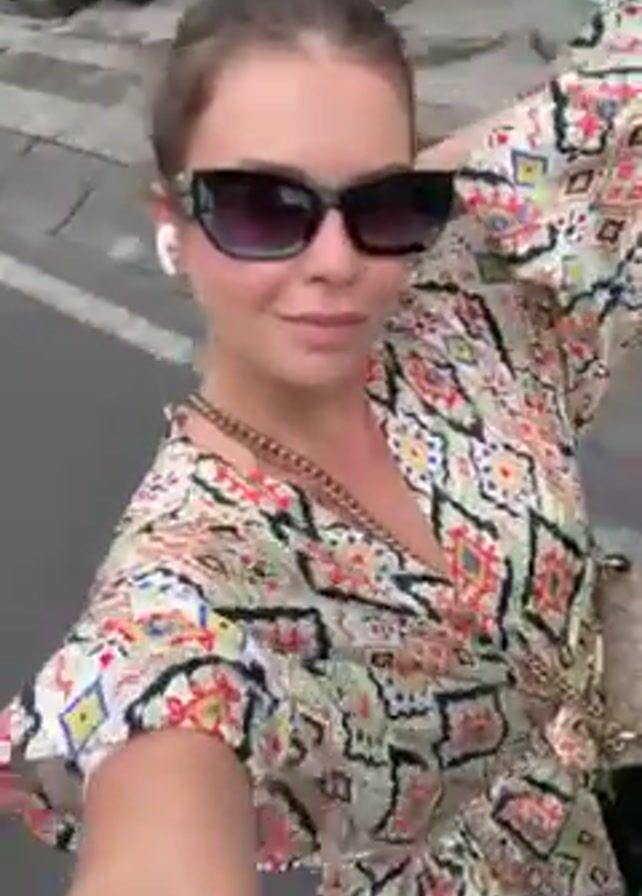 A woman with sunglasses, a patterned top, and a gold necklace is taking a selfie video in an outdoor urban environment