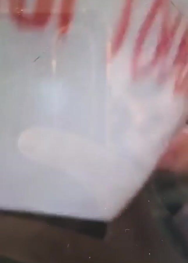 A woman is holding a white bowl with the words "DO NOT TOUCH" written in red on it. She is holding a cellphone in front of her face, capturing the image. The camera on the phone is visible. The background is out of focus. The woman has long brown hair and is wearing a ring on her finger. The image is slightly blurry and has some visual artifacts.