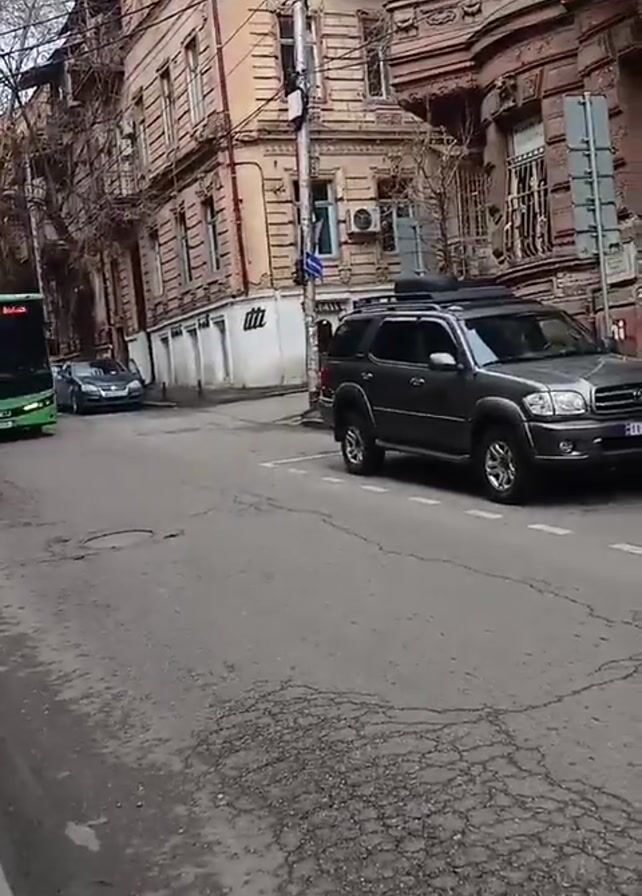 A street scene reveals a green and black bus, labeled as an ISUZU, proceeding on a cracked asphalt road. It is marked "390 Armazeni, 4 თ ა რ ო ვ რ ე პ ი ლ ი". The bus drives past a dark SUV parked on the right side of the road. The backdrop is characterized by older, multi-story buildings with ornate detailing on their facades. Trees with bare branches are also visible, along with a few other parked cars in the distance. The sky appears overcast, suggesting a somewhat bleak day.