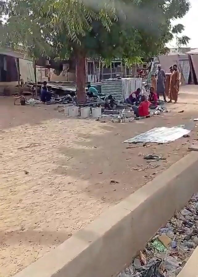 group of people working outdoors in a sandy area under a tree. Some are seated on the ground, apparently working with metal objects, and others are standing nearby, observing or interacting. There are numerous metal sheets and container-like objects scattered around the work area. A concrete drainage ditch filled with litter runs along the edge of the scene. The area is cluttered and has a makeshift appearance. The sun is shining brightly, creating a glare in the video. There is a distinct sound of metal being hammered.