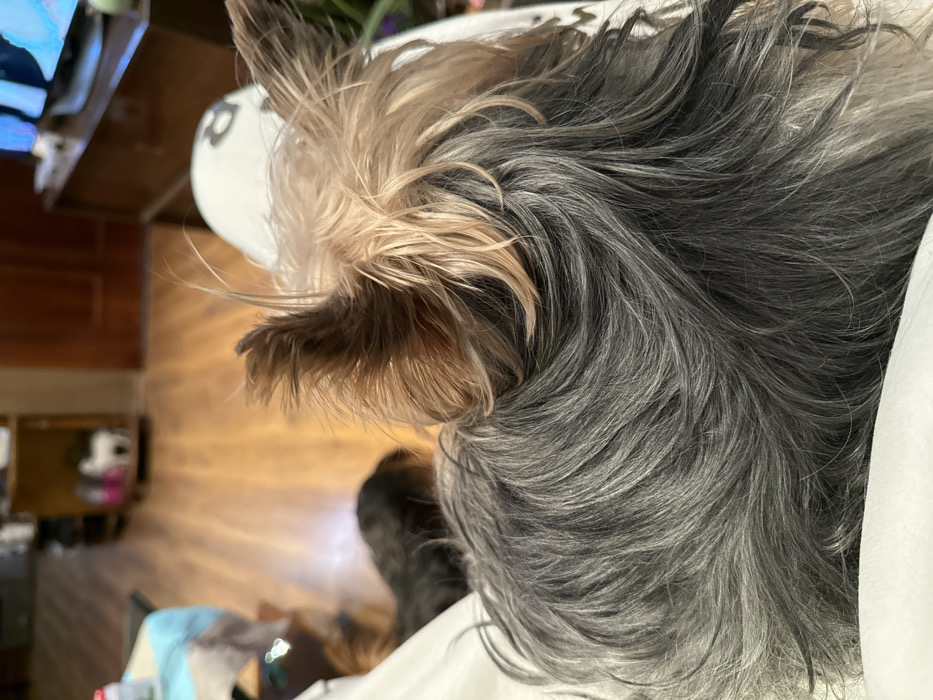 The image depicts an indoor residential scene in Sofia, Bulgaria. The foreground presents the posterior view of a Yorkshire Terrier, featuring a grey and black body coat with tan-gold fur on its erect ears and head. The animal is situated on white fabric. In the midground, a second, blurry, dark-furred dog is partially visible, resting on a light brown wooden floor. The background details include the wooden floor, a brown wooden door, a television set atop a dark console, and a wooden shelving unit displaying various objects.