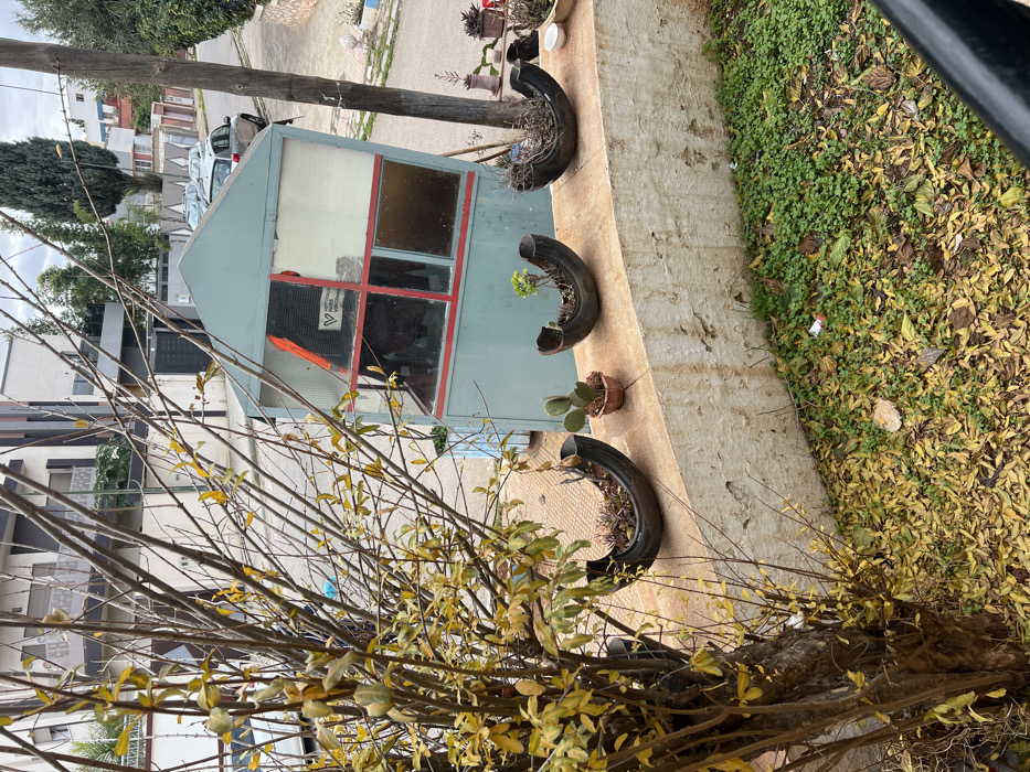 This image depicts an outdoor urban environment within the city of Meknes, Morocco, under an overcast sky. In the left foreground, a deciduous tree or large shrub with thin branches and sparse, yellowing leaves partially frames the scene. Below the tree, the ground is covered with green groundcover and a dense layer of fallen yellow leaves. A light-colored concrete retaining wall spans the midground. On top of this wall, three dark, repurposed tire planters, cut lengthwise, contain small plants and soil. Between the second and third tire planter from the left, a small terracotta pot holds a prickly pear cactus. Behind the wall and towards the right, a light blue-green hut-like structure, resembling a kiosk or guard post, features a sloped roof and multiple windows with red framing. A partially visible sign on one of its upper-left window panes reads "ASSOCIATION VIRGINIE DE VINCENNES". Beyond the structure, a paved residential street curves uphill to the right, flanked by multi-story buildings and several parked vehicles. A dark wooden utility pole stands vertically on the right side of the frame, and various trees, including a tall conifer, are visible further in the background.