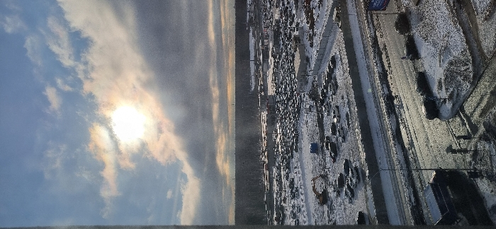 This image depicts an elevated view of a winter landscape in Kudrovo, Russia. The scene is illuminated by a bright, diffused sun, partially obscured by white and gray clouds in a blue sky, exhibiting a subtle halo effect. In the midground, a dense, dark forest forms the horizon, with several utility poles or communication towers visible above the treeline. Below the forest, an expansive snow-covered area features multiple large parking lots filled with hundreds of vehicles, predominantly dark-colored cars, partially dusted with snow. Several buildings, including a prominent multi-story commercial or retail structure, are visible within this complex. An orange excavator is present in a snow-covered section, alongside stacks of white, tarp-covered materials and a blue portable cabin or container, suggesting ongoing construction or storage activities. Concrete barriers or fencing demarcate various sections of the commercial area. In the foreground, a multi-lane asphalt road runs horizontally, partially cleared of snow, revealing a wet and reflective surface. Several vehicles, including dark passenger cars and a dark truck, are present on the road and along its snowy shoulders. Streetlights and traffic signal poles are erected along the roadside, and a large billboard is visible on the right. Accumulations of snow line the road edges and cover unpaved ground. No individuals are clearly discernible.