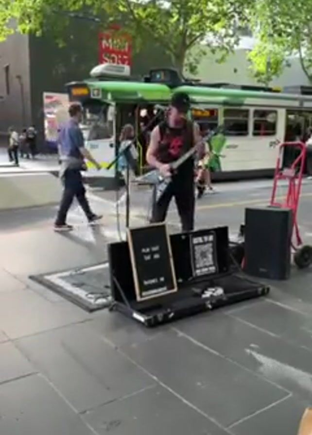 A busker plays electric guitar on a sidewalk. He is playing through an amplifier and has two signs in front of him. One sign reads "Play Fast Eat Ass" and the other has a QR code and reads "Donate To Me." He is wearing a black sleeveless shirt, black pants, and a black cap. A green and white tram passes behind him. People are walking on the sidewalk in both directions. There are trees on either side of the street. A small red trolley sits to the right of the musician. A brown paper bag sits on the ground in the lower right corner.