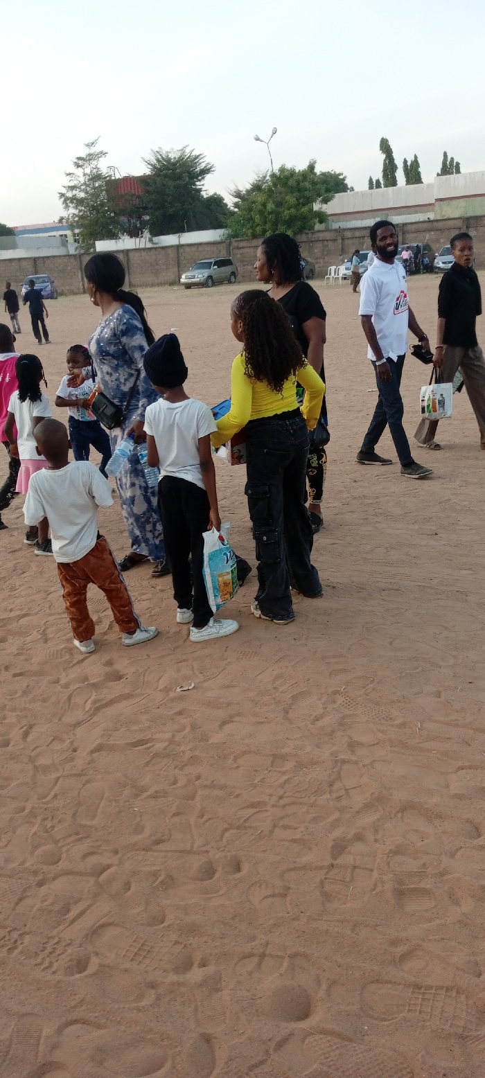 A group of people of various ages and ethnicities are gathered on a sandy lot, some carrying bags and boxes. Several children are present, and adults are dressed in casual clothing. Background includes cars and buildings behind a wall, along with trees and lampposts. The sky is overcast, suggesting either early morning or late afternoon.