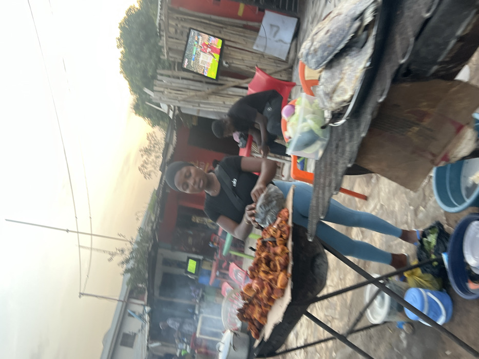 An outdoor food stall is bustling with activity. A woman in blue leggings and a black shirt is serving fried food from a tray. Smoke rises from the cooking area. Behind her, a man sits on a red chair. A television mounted on a bamboo structure displays a soccer game. Various containers, possibly for washing or storage, are scattered around the stall. The overall scene suggests a vibrant, informal food business.