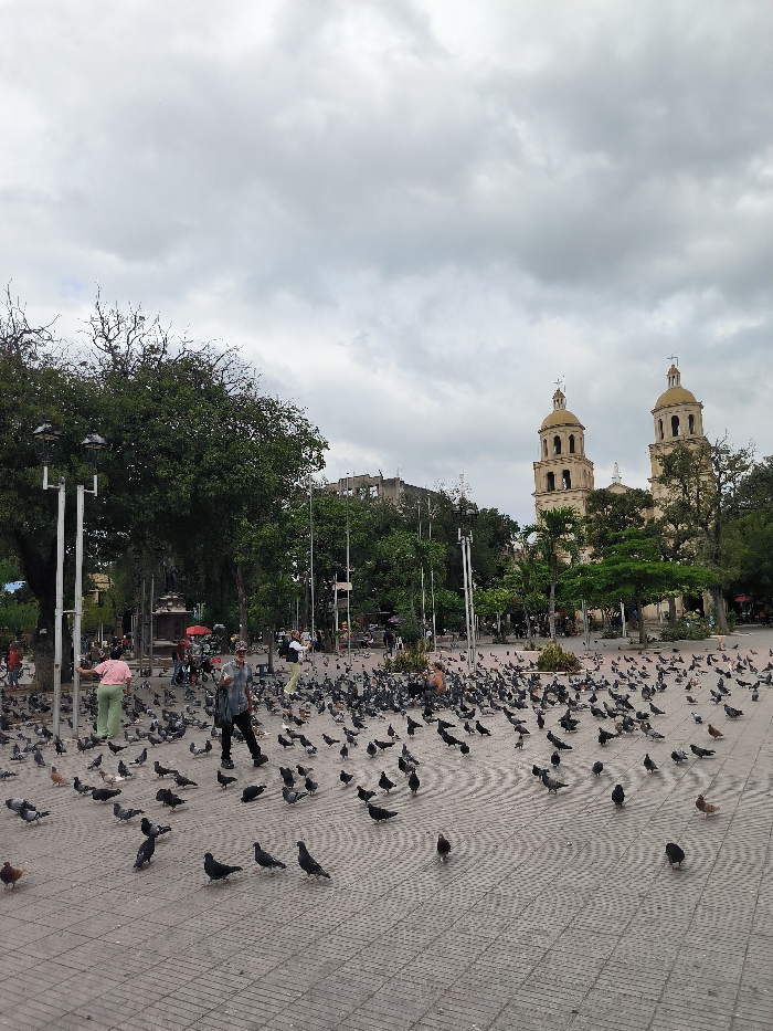 A town square scene features a large flock of pigeons scattered across a paved area. People can be seen interacting with the birds. In the background, a pair of tall, light-colored church towers rise above the surrounding trees and buildings. Overcast skies add a somber tone to the urban landscape. Tall light posts and various trees are interspersed among the flock.