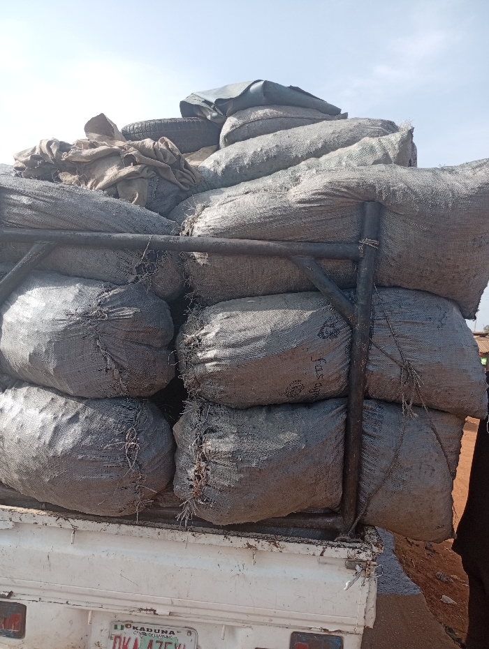 - "A white pickup truck, bearing a Kaduna State, Nigeria license plate ("DKA-42FM"), is depicted in Agunu, Nigeria, overloaded with a dense, multi-layered stack of numerous large, dark-grey woven sacks, likely containing charcoal" by FM-2tuG03, licensed under CC BY 4.0