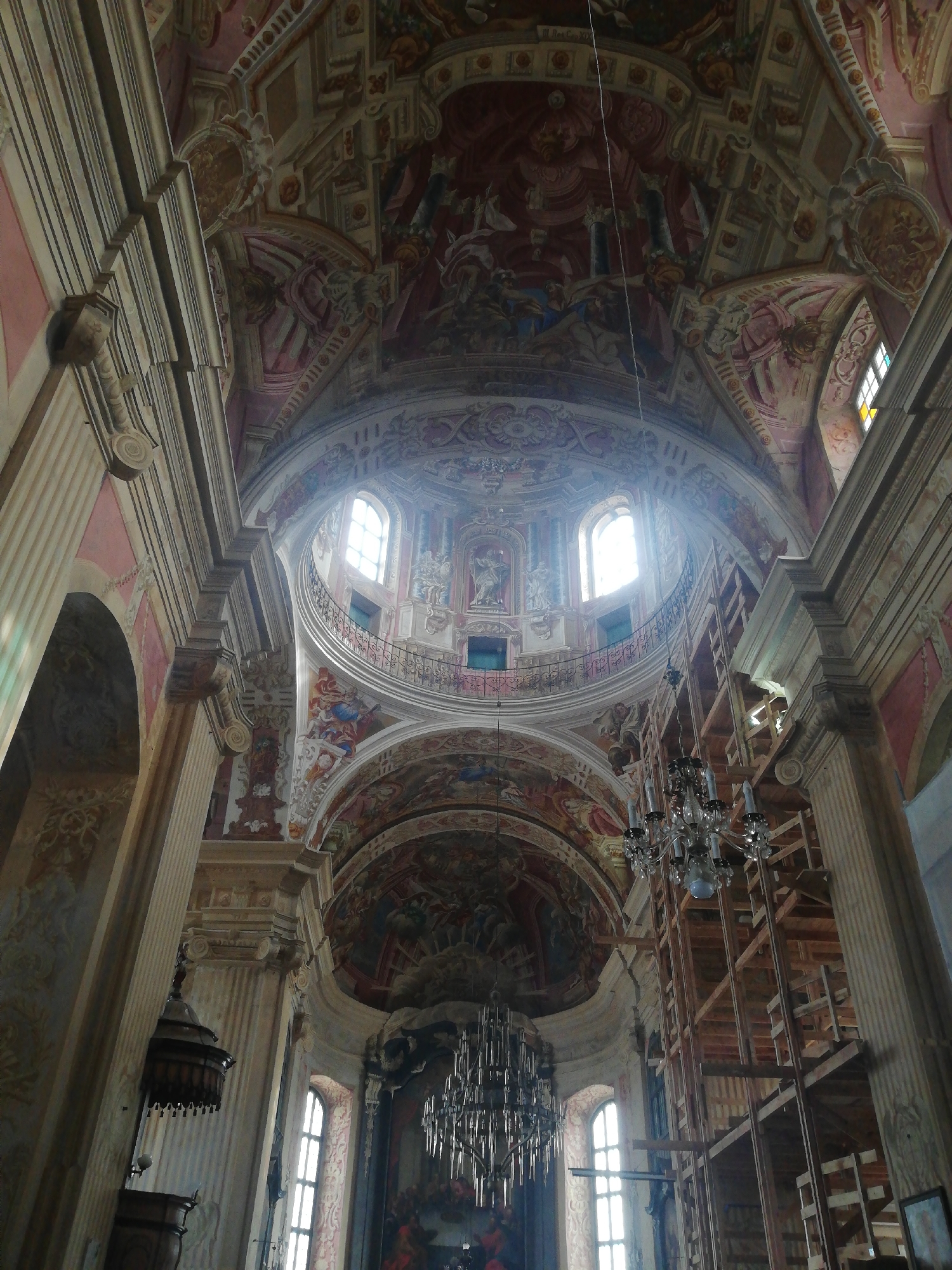The image captures the elaborate interior of a large, high-ceilinged ecclesiastical building, specifically located in Nyasvizh, Belarus. The perspective is an upward view, emphasizing the ornate vaulted ceilings, multiple domed sections, and supporting architectural elements. The ceilings and domes are extensively adorned with frescoes and painted stucco decorations, primarily in shades of red, gold, and blue, depicting numerous human figures in various religious or allegorical scenes. Fluted columns with ornate capitals line the walls, painted in light tones and separated by reddish-pink wall sections. Several arched windows with bright natural light illuminate the upper portions of the interior; one window in the upper right exhibits faint multi-colored glass. A curved balcony with a dark, decorative metal railing is situated within an upper dome section. A dark wooden pulpit with a sounding board is affixed to a pillar on the left side of the frame. Two large, multi-tiered chandeliers hang from the ceiling; one in the central foreground is constructed of crystal or glass, while another, simpler one is visible further back on the left. A prominent, multi-level wooden scaffolding structure occupies the right side of the frame, extending from the floor to the upper reaches of the ceiling, indicating ongoing restoration or construction work. No individuals are visible within the scene.