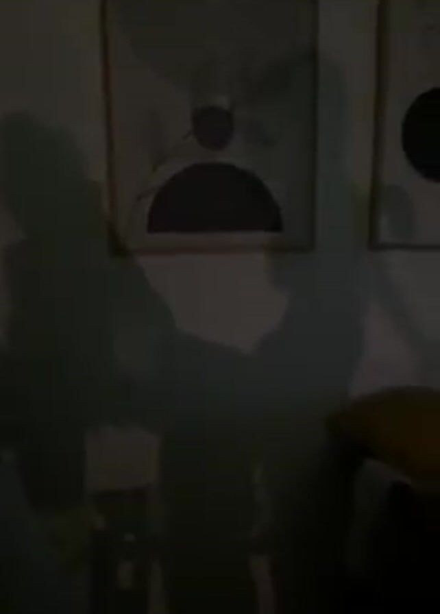 dimly lit room, with shadows cast on a white wall. There are two framed art pieces hanging on the wall. The first art piece appears to be an abstract design with geometric shapes, including a semicircle, circle, and curved lines. The second art piece is similar in style. The shadows suggest the presence of people in the room, likely dancing or moving to music. A chair is faintly visible, and part of a sofa is visible in the lower right corner.