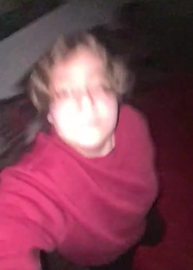 person with curly hair and wearing a red sweatshirt falling backwards onto a red surface, which appears to be a bed or couch. The background is blurry, showing a wall and possibly furniture. The camera is handheld and follows the person's motion.
