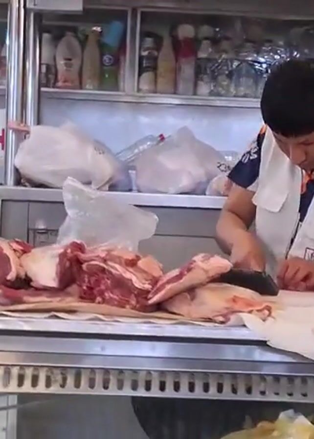A man is cutting meat on a metal counter in what appears to be a butcher shop. He is wearing a white vest and a patterned shirt. The counter is covered with pieces of raw red meat. Behind him, shelves are stocked with various items, including bottles and plastic bags. A digital scale hangs from the top of the shelf. Below the counter is a display case and a bag. The butcher is focused on his work, using a knife to portion the meat. The scene is well-lit, and the overall impression is that of a bustling marketplace.