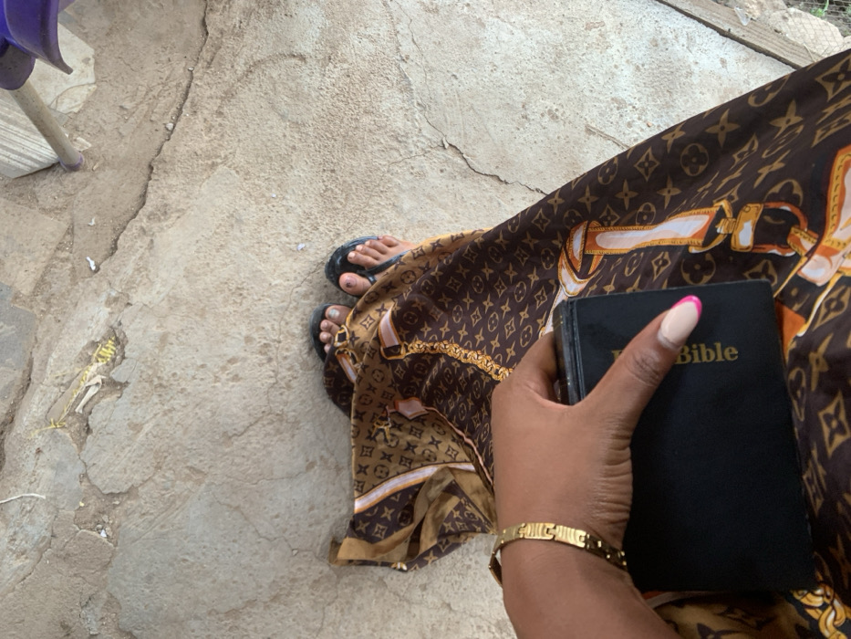 A person in a patterned brown and gold scarf-like garment, seated on a gray cracked concrete surface, holds a black Bible. Their feet, adorned with dark sandals, are visible beneath the fabric. The person wears a gold bracelet on their wrist. A chair leg appears in the upper left corner, adding context to the seating arrangement. The scene gives a sense of personal reflection or quiet moment with scripture.