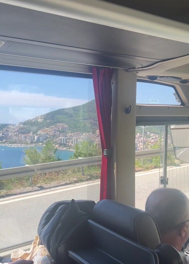 view from inside a bus, primarily focused on the driver and the view outside the front window. The driver, a balding man with glasses, is seen operating the bus. Outside the window, the road is visible, with cars passing in the opposite direction. The background includes a landscape with mountains and a coastal town nestled near the sea. A red curtain hangs near the window on the left side of the frame. The interior of the bus is visible, including passenger seats and overhead storage compartments.