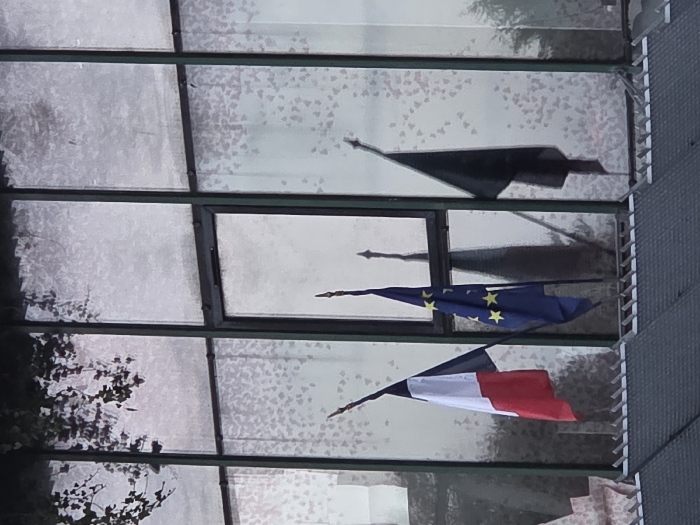 This image depicts a section of a modern building facade in Hérouville-Saint-Clair, France. The facade consists of multiple rectangular glass panels framed by dark mullions. Many glass panels exhibit a semi-transparent, light-colored patterned film or etching, appearing as numerous small, irregular shapes. Three flags are visible, positioned below the primary glass facade and extending upwards from a dark-colored horizontal ledge. From left to right, these are: 1. The national flag of France, displaying vertical blue, white, and red stripes. 2. The flag of the European Union, featuring a blue field with twelve yellow stars arranged in a circle. 3. A solid black flag. All flags are partially unfurled, hanging downwards from their respective poles. The flagpoles have pointed finials at their tips, casting distinct reflections on the glass panels behind them. The horizontal ledge below the flags is fitted with multiple rows of metallic anti-bird spikes. The reflective surface of the glass facade shows muted reflections of an overcast sky and distant dark foliage. Dark green vines with leaves are visible growing over the upper left edge of the building structure. No individuals are present in the scene.
