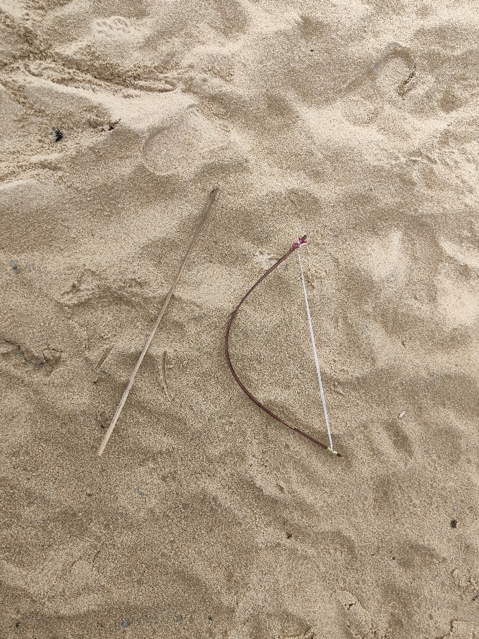 The scene, located in Thuận An Ward, Vietnam, displays a granular, light brown sand surface marked by subtle undulations and shallow impressions. Two distinct objects rest on the sand. On the left, a straight, slender stick, light tan in color, lies diagonally across the frame. To its right, a curved, dark reddish-brown object, consistent with a flexible twig or root, has a white string tautly stretched between its two ends. The string is secured at the object's upper terminus by a small, dark reddish binding, and at its lower terminus by a small, yellowish or light-colored knot. Scattered dark particulates are visible across the sand. No individuals are present, and no actions or interactions are depicted.
