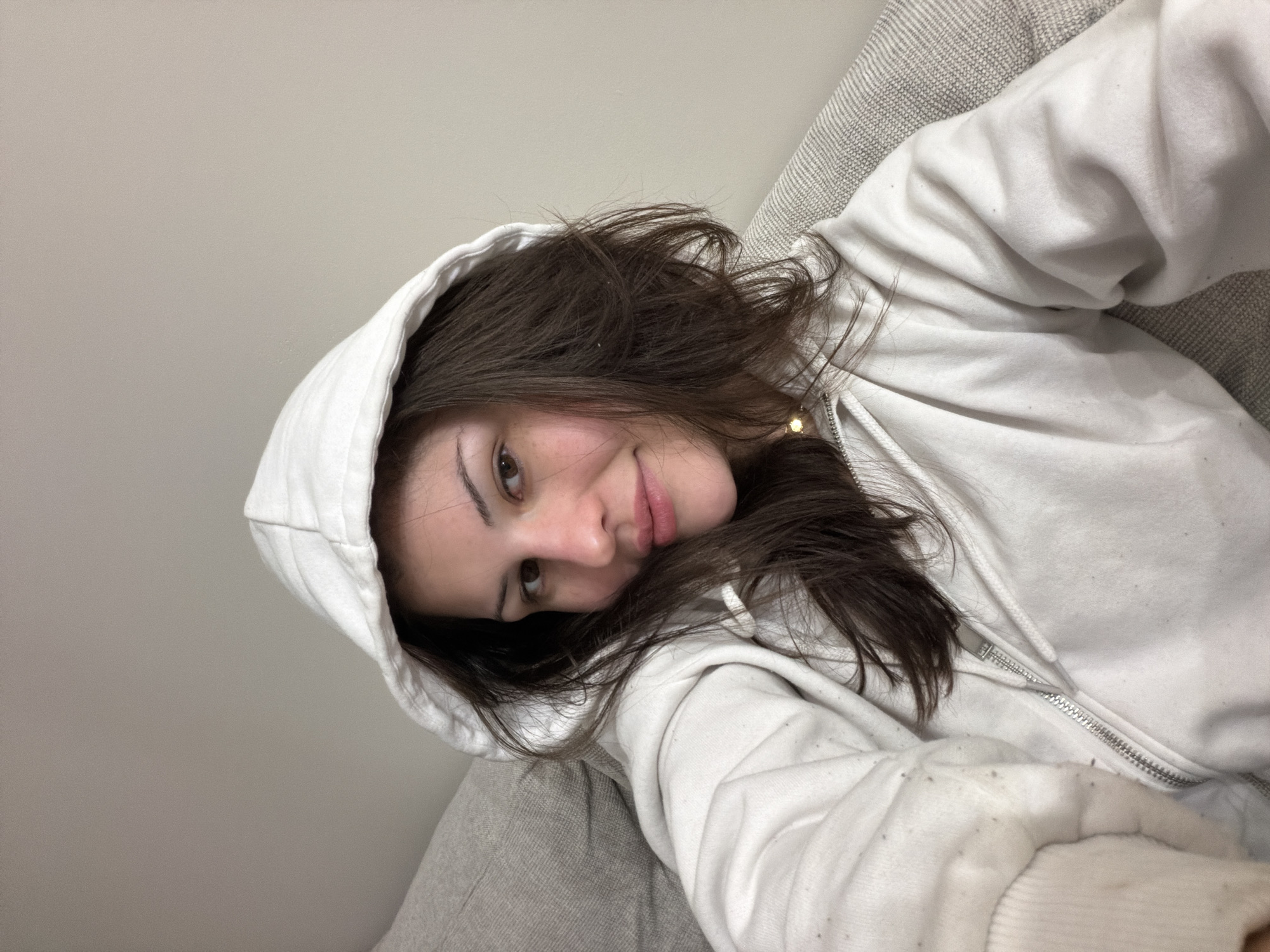 A young woman with dark brown hair, wearing a white hooded sweatshirt, is reclining on a grey couch or cushion