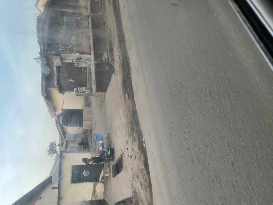 This image depicts a street scene in Jos, Nigeria, viewed from a vehicle on a paved road. The foreground shows an asphalt road surface with minor debris. To the left, a female individual, dressed in a yellow long-sleeved top and dark skirt, stands facing a small wooden table. On the table, various items are visible, including a blue bowl, a green bowl, and other smaller containers. A black basin rests on the ground near her feet. Adjacent to her position is an open concrete drain. Behind her is a light-colored building with a dark metal door featuring white markings and a small wooden bench. Further back in the center, a large black cylindrical water tank is elevated on a concrete base. Behind the tank, another person is dimly visible amidst a light plume of smoke or dust, suggesting an activity involving fire. To the right, a building with a deteriorated concrete facade features multi-colored graffiti, including words like "Educate." This building has a dark metal gate and a low, raised concrete wall along its front. Additional single-story buildings with corrugated metal roofs are visible throughout the background under a hazy sky. Sparse trees are present in the distance.