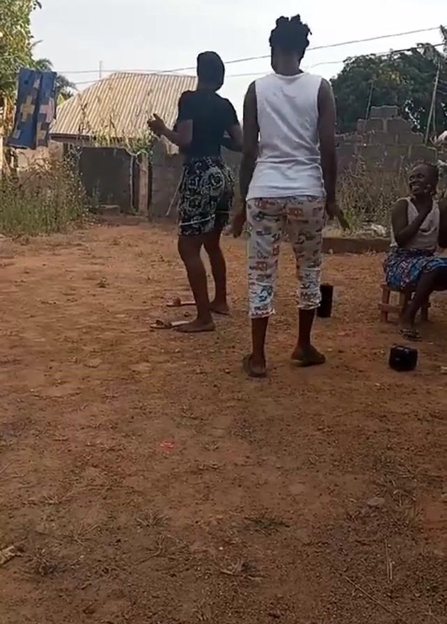 Two young women are dancing barefoot to music outdoors in a yard. One is wearing a black t-shirt and patterned shorts, and the other is in a white tank top and patterned capri pants. They are facing away from the camera, moving their bodies and arms to the beat. A third young woman is sitting on a small stool watching them and clapping her hands. The ground is dirt, and there are a few pairs of sandals scattered around. In the background, there are some simple buildings, a clothesline with laundry hanging, and some vegetation.
