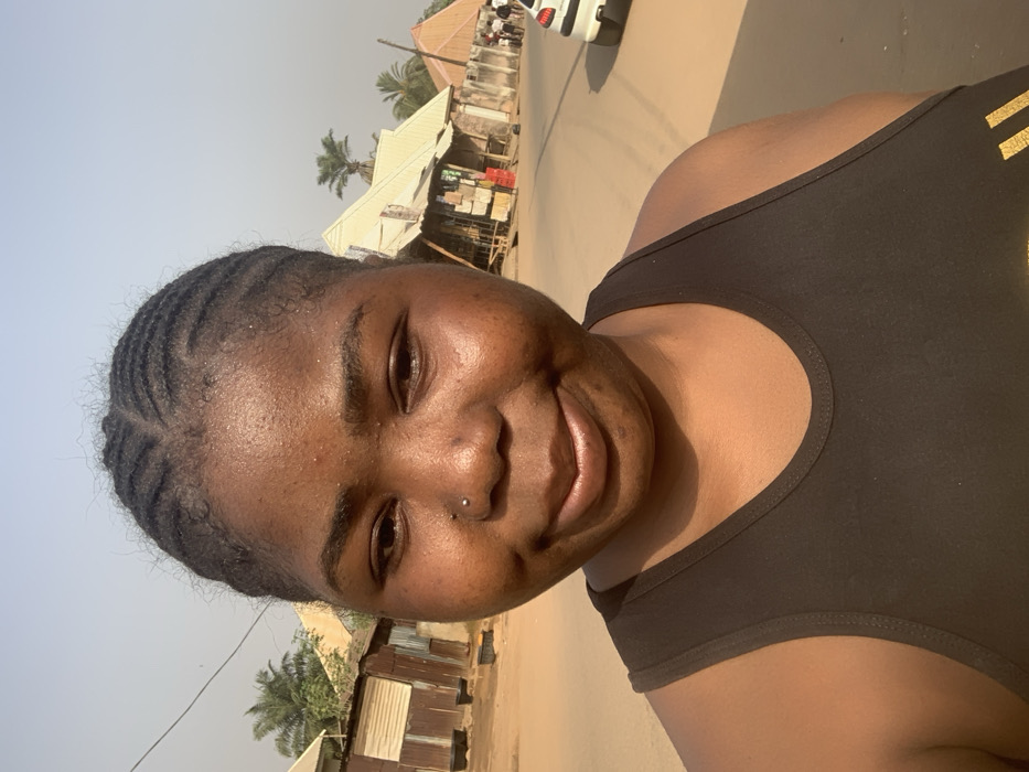 The image presents a close-up, eye-level portrait of an adult female of African descent, positioned centrally. She has dark skin, neatly braided cornrow hair pulled back from her forehead, and a small silver stud piercing in her right nostril. Her expression is a subtle smile, and she is looking directly into the camera. She is wearing a black sleeveless tank top. The background reveals an unpaved, brownish-orange dirt road stretching into the distance, marked with tire tracks. Along the left side of the road, several structures with corrugated metal walls are visible, along with green vegetation and dark cylindrical objects on the ground, possibly buckets. On the right side of the road, further back, more buildings are present, including one with a light-colored, sloped roof and another with a darker, triangular roof, indicative of shops or residences. Red crates are visible near one of these buildings. Palm trees and other foliage are scattered throughout the background. A portion of a white car is visible on the far right of the road. Several indistinct human figures can be seen further down the street on the right. The sky is a pale, hazy blue. The scene is situated outdoors in the city of Akwanga, Nigeria.