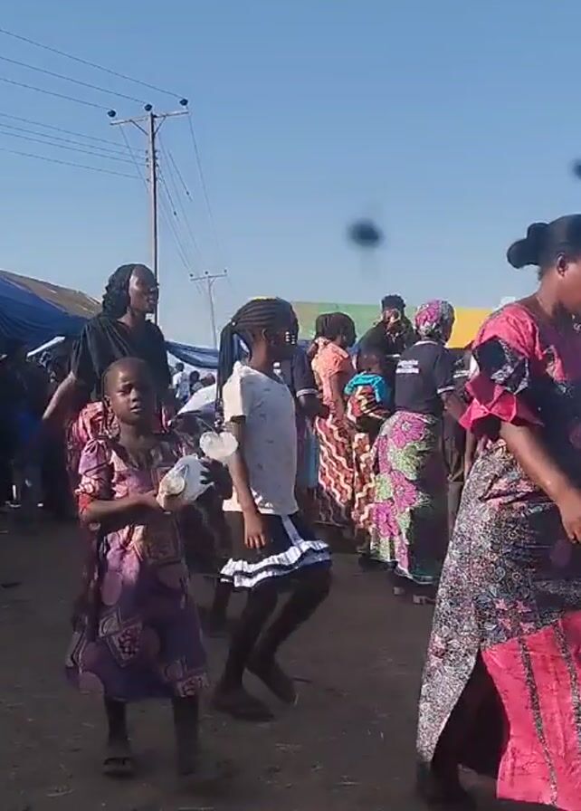 gathering of people in an outdoor setting under a clear blue sky. The people, primarily women and children, are dressed in colorful, patterned clothing. Several individuals are walking towards the camera, while others are gathered in groups. A little girl in a purple dress is carrying a plastic bag filled with items. The background features a large tent and utility poles with wires. The ground appears to be dusty. A distinct beat drives the music heard.