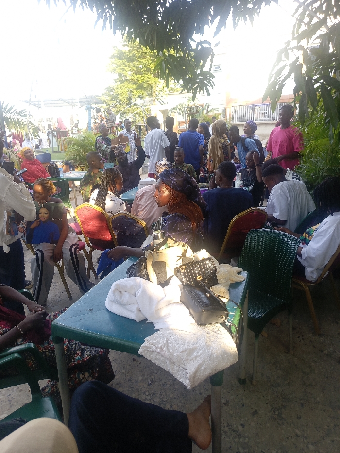 The image depicts an outdoor social gathering in Lafia, Nigeria, observed from a low angle under substantial tree foliage providing shade